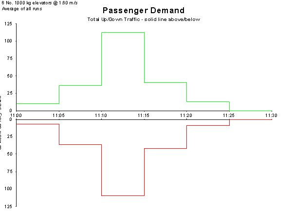 Passenger Demand plots the traffic that has been generated as a result of your inputs in Building Data and Passenger Data. The traffic is divided into traffic up and down the building.