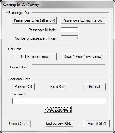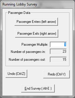 The in car survey requires the observer to be standing or sitting in the elevator. Passenger entering and exiting the elevator are recorded in the same way as they are in the Lobby Survey.