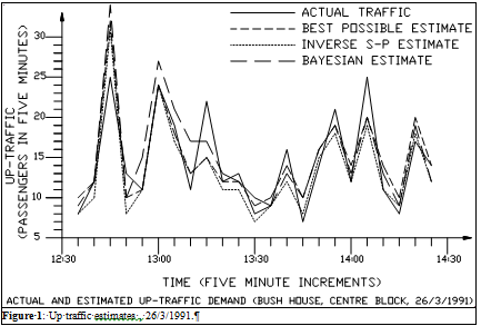 Figure 1 shows the results of the up traffic plots for 26/3/1991. The results for 27/3/91 have not been shown here. It can be seen that best possible estimate represents the best performance. The Bayesian estimate does not offer any better performance than the I-S-P estimate. The summation of the square of the errors is used as a criterion for estimate performance, but results are not shown here.