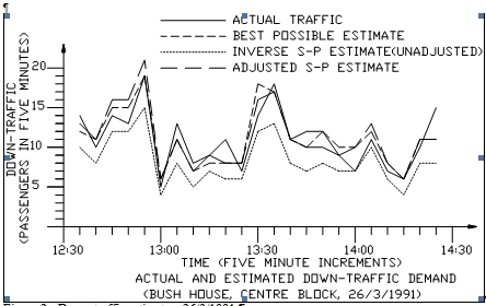 The previous estimation techniques can be used in the same way to analyze down traffic with one difference. It has been shown, (Barney & dos Santos, 1985, pp 230; Al-Sharif, 1991b) that the probable number of stops in down peak are between 40% to 60% of the probable number of stops in the up peak case (different values applying to different control algorithms). Thus the I-S-P estimate has to be multiplied by an adjusting factor, which is the inverse of the above figure. The most suitable figure was found and the values adjusted accordingly. The plots show both adjusted and non-adjusted I-S-P estimates.