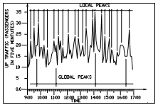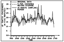 As an application of the previous method, automatically gathered raw data was processed according to the I-S-P method. The raw data was available for the four consecutive days (2-5 April 1991). One of the results is shown in Figure 3 (the other results are shown in Al-Sharif & Barney, 1991c), where the numbers of up-travelling passengers in five minute intervals were plotted against time. The numbers do not include interfloor traffic or down traffic (Al-Sharif & Barney, 1991d).