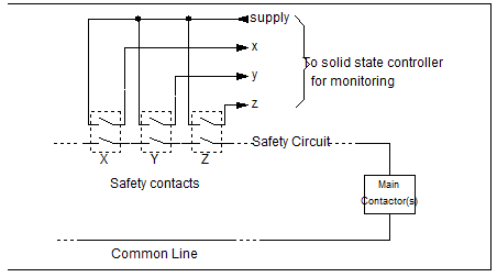 There is a need with modern solid state controllers to monitor the state of safety contacts and safety devices. This is useful in condition monitoring and in troubleshooting, where the information about the safety devices in stored in the solid state controller. Several methods exist for achieving this objective, provided that the do not jeopardize the integrity of the safety circuit. This section discusses some of these methods, with their advantages and disadvantages.