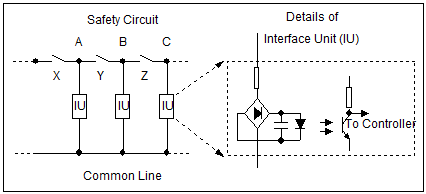 In some cases, the safety device has only one pair of contacts. In such a case, the contact is wired in the safety circuit, and an electronic circuit interface is used to feed the information to the controller. The Interface Unit is optically isolated from the controller, and incorporates a resistor for limiting the current, a full wave rectifier (if the safety circuit voltage is AC) and a capacitor for filtering.