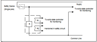 There is a need to monitor the status of safety devices for troubleshooting purposes. Several methods exist, but the best method is to use double pole safety devices, where one contact feeds the solid state controller and the other is wired in the safety circuit.