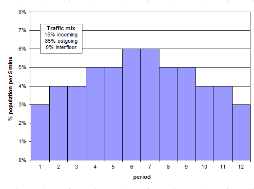 Elevate generates an example morning peak traffic profile for a residential building based on survey data published by Dr Marja-Liisa Siikonen at the Lift & Escalator Symposium. For a discussion of the application of this template, please see CIBSE Guide D 2015. The simulation runs between 07:30 hrs and 08:30 hrs.