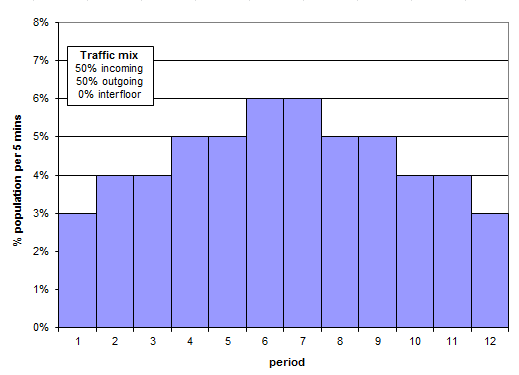 Elevate generates an example evening peak traffic profile for a residential building based on survey data published by Dr Marja-Liisa Siikonen at the Lift & Escalator Symposium. For a discussion of the application of this template, please see CIBSE Guide D 2015. The simulation runs between 17:30 hrs and 18:30 hrs.