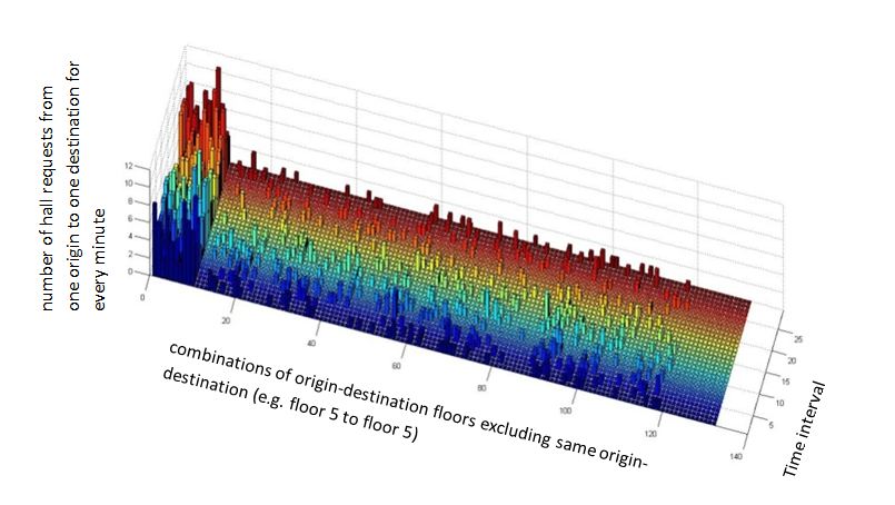 When the passengers travel in multi-storey building using lifts, they use the up and down call buttons of a lift system to register landing calls. These landing calls are assigned to one lift by a control unit called a lift group control system (LCGS). The information about the requests and the number of passengers boarding and alighting for each stop can be recorded and this data used to extract passenger flow patterns specific for the building. The passenger flow can be converted into origin destination matrices. These matrices show the number of passengers moving from one origin of the transportation network to a destination for a period of time.