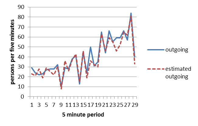 The X axis runs from 1 to 29, the number of 5 minute intervals between 10:30 and 12:50, have both been included. There were a total of 1015 passengers manually counted as incoming flow and we were able to detect 960, corresponding to an accuracy of 95%. We lost some journey data because the movement complexity of some journeys was impossible to solve. They were so complex that the symbolic equations could not be solved. It is possible that some additional rules could be added to achieve a better fit.