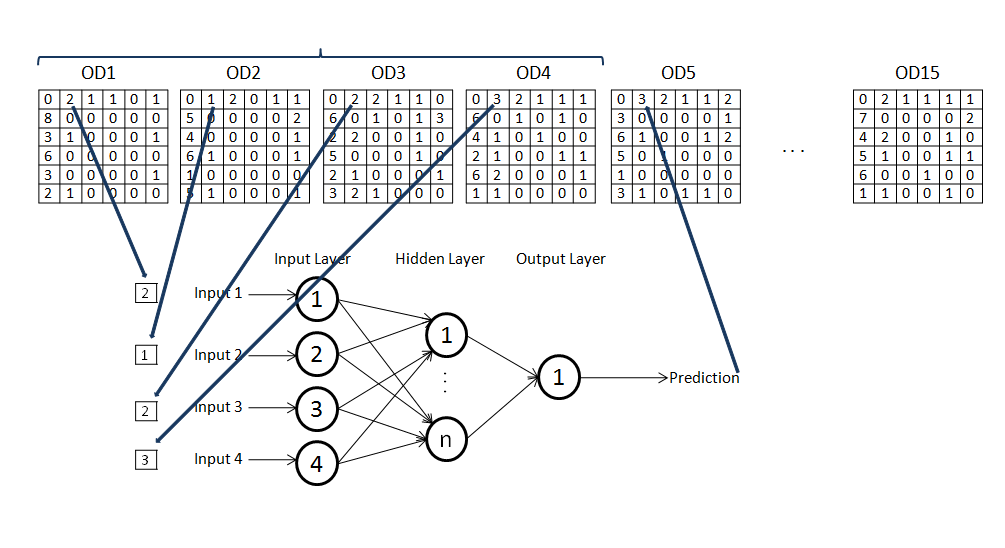 The topology of the neural network is a question that can be discussed. In this work we are going to use quite a simple topology, where the input layer is going to have h=4 neurons and the hidden layer is going to have 10 neurons. The output layer will have only 1 neuron. The neural network will be trained with the previous 4 values, xt-4 xt-3, xt-2,xt-1, , and the result of the neural network will be xt. Figure 5, shows this structure and the relationship with the OD matrices. 132 different neural networks were created and trained with requests data specific to each origin and destination and the previous 30 intervals time data used for the neural network training. After that, 14 consecutive time intervals data are given to the neural network as an entry and the prediction results used to evaluate the forecasting step.