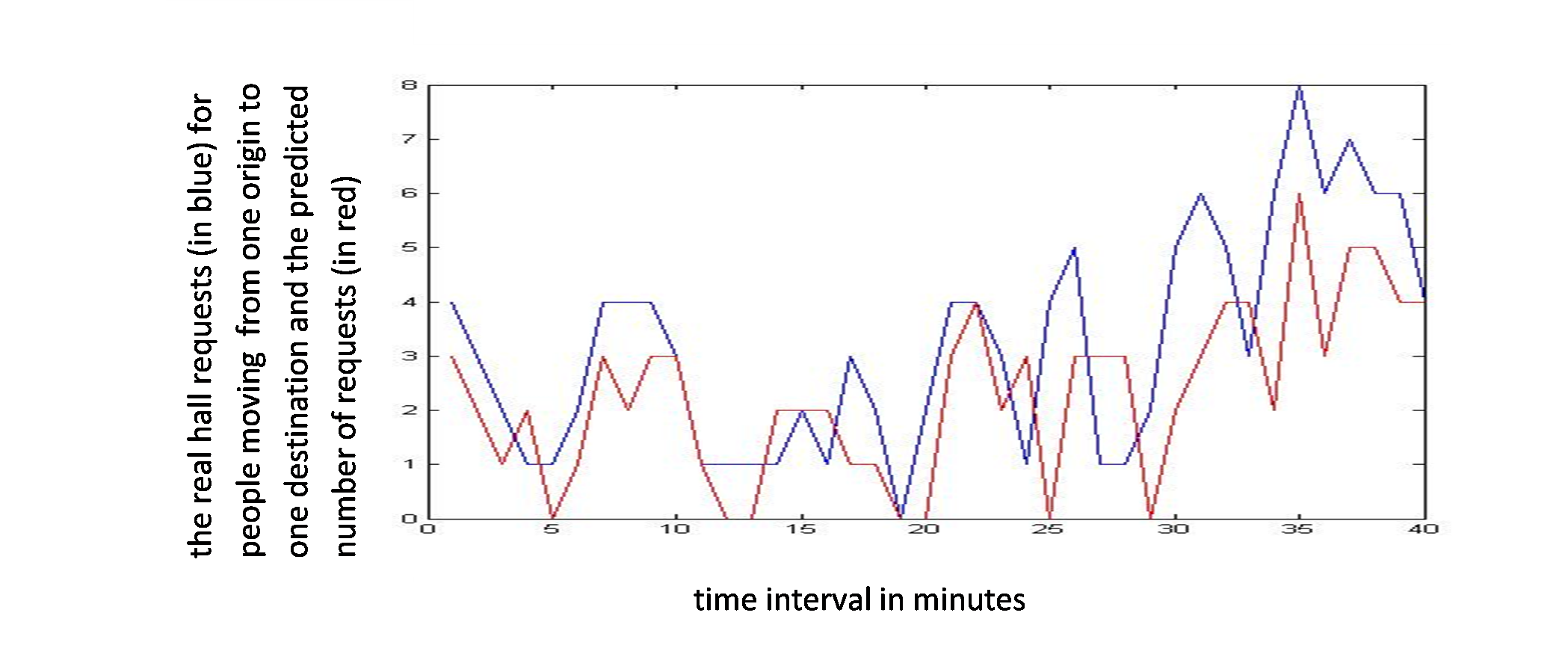 Figure 6 shows an example of real requests coming from one origin and going to one destination, in blue, and the predicted requests for the same origin and the same destination, in red.