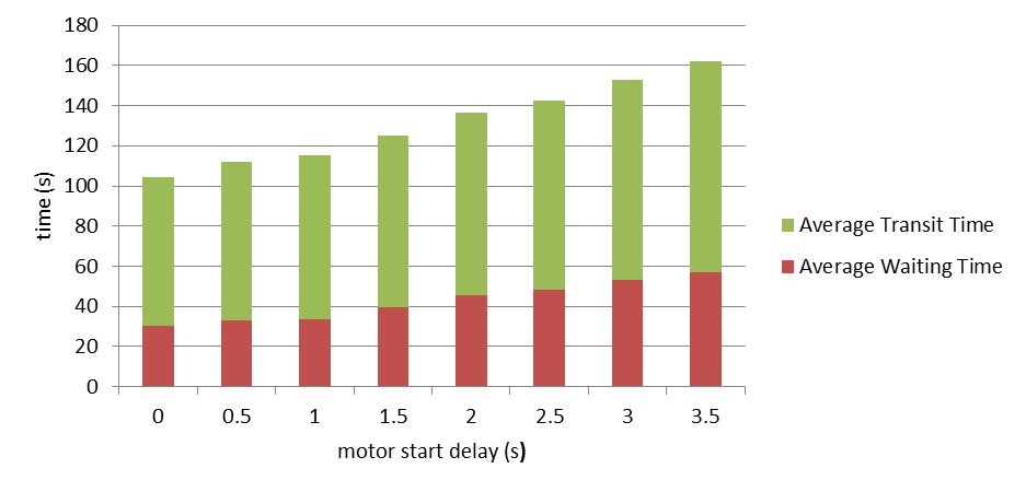 To investigate the impact of a single parameter, consider a simulation of a building with lunch time traffic, based on Example 4.3 in CIBSE Guide D 2010 (1). This simulation is repeated for increasing start delay. The average waiting time and transit time to destination is plotted in a stacked area graph, Figure 12 .