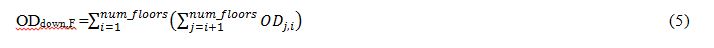 To start the estimation, the first OD is read. At this moment there is no data from the origin, so the estimation comes only from the information that can be taken from the OD. For the first interval of 50 seconds, the estimation is the value of the OD/3. After 50 seconds, an origin data set is created, so for the next estimate (from 50 seconds to 100 seconds), the origin data is taken into account. In this second estimate, we have the OD/3 value as before, but the difference between the estimation of the first interval and the actual value is added; see Eq. 6 for up direction and Eq.7 for down direction. This is used to balance the information. If most passengers from the pattern move in the first interval the second interval and maybe also the third one is consequential. The same will happen if the passengers estimated from the first interval are not as in reality.