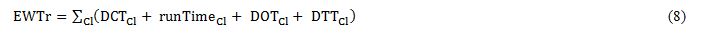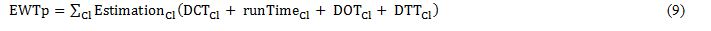 Once the passenger flow pattern has been learnt, we need to use it in real time, when the algorithm is taking the decision about which lift should serve each call. If it is assumed that nothing is known about the future, we can estimate the waiting time for the calls assigned to one lift for the MTSP as in Eq. 8, adding the different times needed for the lift to arrive and pick up a passenger waiting for it across different floors, the door close time (DCT), the runtime from the place where the lift was to the passenger’s floor, the door open time (DOT) and the transit time (DTT).