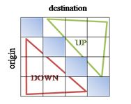 As it can be seen, the OD matrix gives future information while the origin data provides information of the recent past events. The OD data has been divided in three parts so that we can compare 3 sets of short term data with the learned profile. Before dividing the matrix, it has to be separated into up and down passenger movements as shown in Eq. 4 (up) and Eq. 5 (down). Fig. 4 represents graphically how the division of the OD is made.