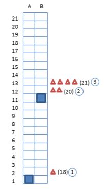 Fig. 6 shows the building that has been used for this example. The building has 21 floors and two lifts, A and B, with a maximum capacity in each of 5 passengers. There are 3 landing calls. One call on the 2nd floor that will go to the 18th floor, this call will be the 1st one. Then on the 12th floor there is another landing call, the 2nd one, and in this case it has as destination of the 20th floor. And to finish there is a 3rd landing call on the 13th floor to go to the 21st floor.