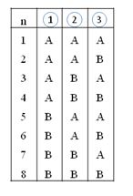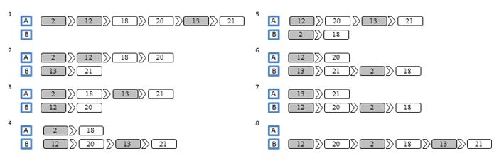 Fig. 7 shows all the possible options the lifts have to serve the calls. For example, the 3rd possibility says that the 1st and the 3rd calls will be served by lift A and the 2nd call by lift B.