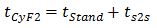 Cycle time at an intermediate floor (both stopping): The minimum cycle time at an intermediate floor with two subsequent cars stopping at the same floor (tCyF2) can be calculated with equation (3). The time between departure of the front car 1 and the arrival of the following car 2 (start to stop time ts2s) depends on the stopping distances and minimum distances between cars and is shown in figure 5. The safe position for car 1 related to car 2 is shown with D2SfP(t) and depends on the position, stopping point of a controlled deceleration with rated values of car 2 and an additional minimum distance between car 2 and car 1. The safe position must not touch the position of car 1. (3)