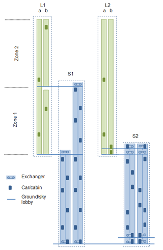 A circulating MCLS is used as shuttle lifts between ground and sky lobbies within a vertical traffic concept [10]. Exchanger units are installed in the ground lobbies and in the upper sky lobbies. Figure 1 shows examples of how a circulating multi car lift system can be included in a vertical transportation concept. Different MCLS (S1) serve the sky lobbies of different building zones (zone 1 and zone 2). The local transportation within the building zone can be provided by traditional lift systems e.g. machine room less systems (L1 b) or by systems with two independent cars in one shaft (L1 a). The latter solution enables direct inter zone traffic. MCLS with double ground lobbies and double sky lobbies (S2) enable simultaneous loading of two cabins in a shaft.