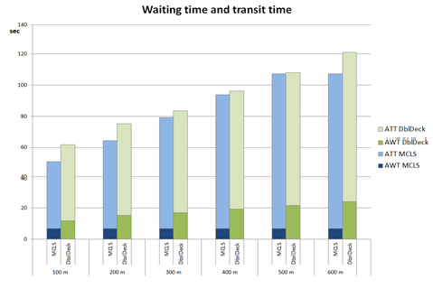 Since the interval of the multi car is constant, the average waiting time is constant. Although the chosen velocity of the multi car is less than the double deck, the time to destination of the MCLS provides better values. This is caused by lower average waiting times and shorter passenger loading/unloading times.