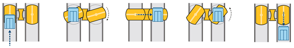 To analyse the stop at an exchanger unit the design of the exchanger unit and the process of exchanging cars between shafts needs to be considered. The analysis is based on a backpack solution including the linear motor and car guidance [10]. The shaft elements are able to rotate by 90°. Cars can move horizontally. Passengers can load and unload during the rotation process since the cabin is held in an upright position. Figure 4 shows a simple example of the functionality of the exchanger unit.