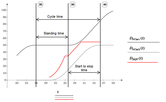 This is also illustrated with figure 7. It shows a complete round trip of a car (D1(t)). The round trip time is divided by the cycle time and shows every position of the car after a period of the cycle time. These positions equal the current position of the other cars in the MCLS at time t=0, which is shown with the two shafts of a MCLS in figure 7. With double entrance configurations and pairs of cars the number of cars is doubled.
