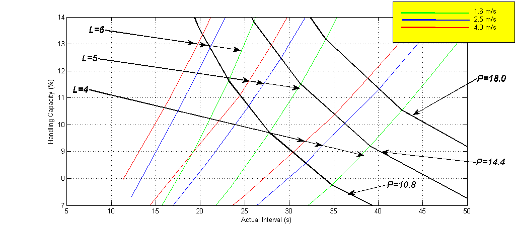 Figure 3 shows a typical curve describing the relationship between the loading factor (some authors use the more generic term, "system utilisation", Barney & Dos Santos, 1985, pp 21), and an index of performance. The ratio of AWT to INT has been proposed as a measure of performance of the lift system (Barney & dos Santos, 1985, pp201). The loading factor is expressed as the ratio between the number of passengers and the rated capacity. The index of performance is taken as the ratio between the Average Waiting Time (AWT) and the Interval (INT), where division by the Interval is a method of normalising the measure of performance.