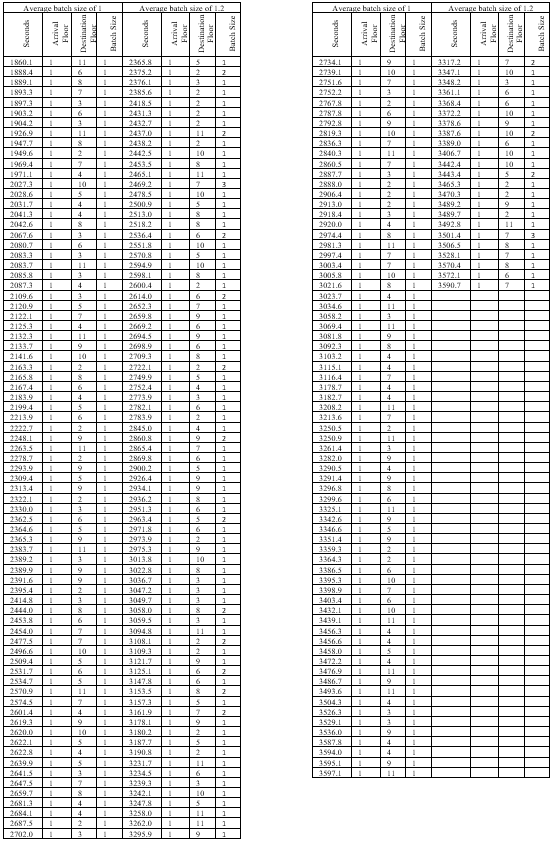 Likewise, the distribution of destinations will tend to 10% (0.1) for each floor as the number of runs increases. Table 6 shows the distribution of destinations generated for the run with batch size 1.