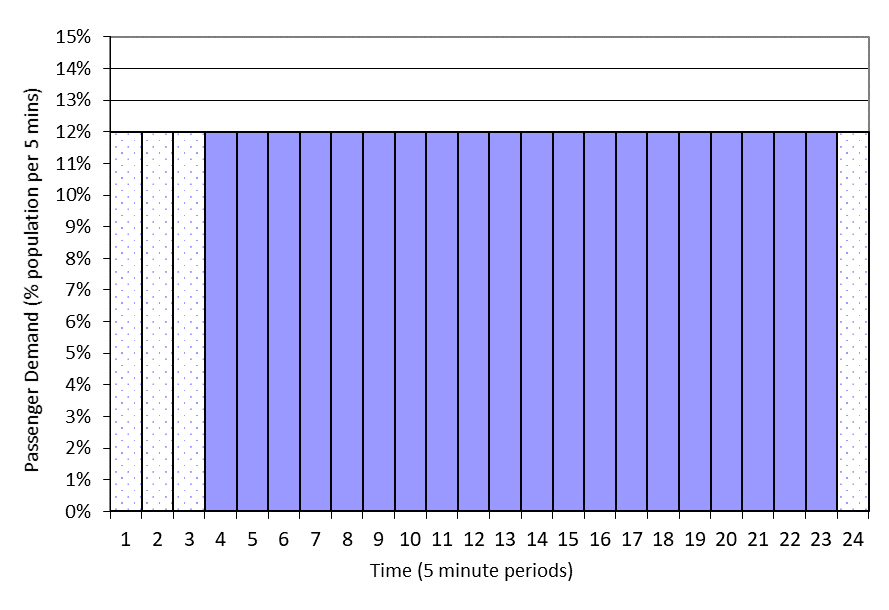 Figure 1 Passenger Demand for constant passenger demand template with first 15 minutes and final 5 minutes results disregarded