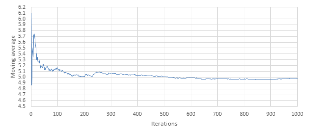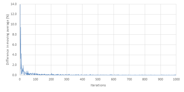 However, as seen in Table 1 and Figure 3, the moving average is subject to large variation. Because the moving average can both increase and decrease as it converges (i.e. not converging as if an asymptote), it also leaves an arbitrary decision as to how many repeated consistent values of the moving average are required before the user is confident in stating that convergence has been achieved; or, for example, what percentage difference is acceptable.