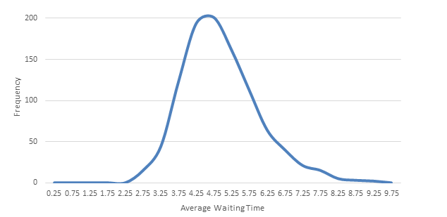 The probability distribution of AWTs determined by simulation varies for each lift configuration and set of simulation parameters (length of simulation, number of people, number of floors, number of lifts, etc.). These distributions are Lognormal (see Figure 5) rather than Normal (see Figure 6) as the AWT can never be less than or equal to 0s, whereas right tail can theoretically be infinitely long. A Lognormal distribution is “a continuous probability distribution of a random variable whose logarithm is normally distributed” [7].