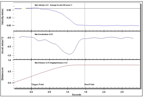 The maximum value of velocity, maximum value of acceleration and the distance traveled following the trigger point are all shown on the plot.