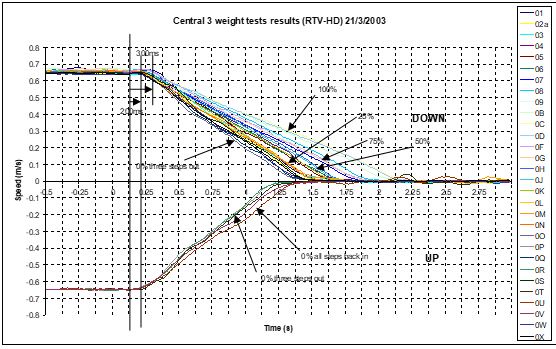 The results of the weight tests have been summarized as speed versus time plots for the stopping escalator with various loads. The plots have been shown for HDM10 type (Figure 2), RTV-HD type (Figure 3), HDMS type (Figure 4) and the Compact type (Figure 5).