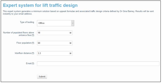 The expert system may be applied in local or on-line software. An example on-line interface is given in Figure 1. This example inputs for an 18 floor (above main entrance floor) building with a floor population of 60 persons, and an interfloor distance of 3.3 m.