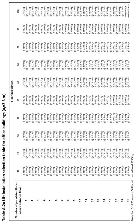 For example, suppose a lift installation is to be selected for an office building with eight floors above the entrance floor and a population of 2000 persons. The circled result shows that there is a choice of either 8 x 1800 kg (which is about right) or 8 x 2000 kg (which provides extra capacity) or 7 x 2500 kg (which requires less lifts). Lift speed selection is assumed to follow Section 2.4.