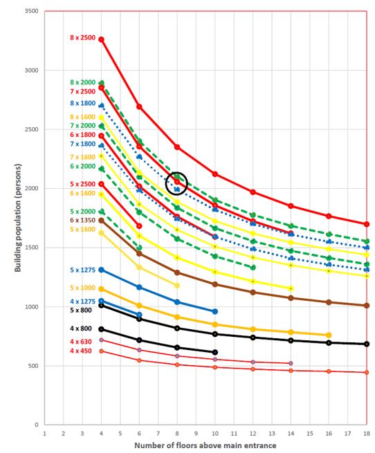 Note that for 18 floors above the entrance floor with a population of 100 persons per floor, the table reports “No solution meets criteria”. This is because eight of the largest lift cars that were considered by the expert system do not meet the design criteria.