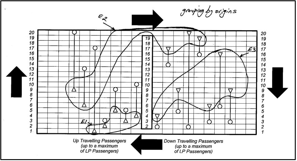 The group of passengers into the lift cars was carried out based on contiguous passenger origins first and then destinations. Grouping based on destinations was advantageous under incoming conditions, while grouping based on origins was advantageous under out-going traffic conditions.