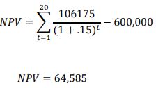 The building management and their lift consultant decide to evaluate the economic feasibility of the lift modernization. They will use the NPV method and will assume a 20 year life and a rate of return of 15%. The rate of return was based on financing the modernization. The NPV based on these values appears as follows: