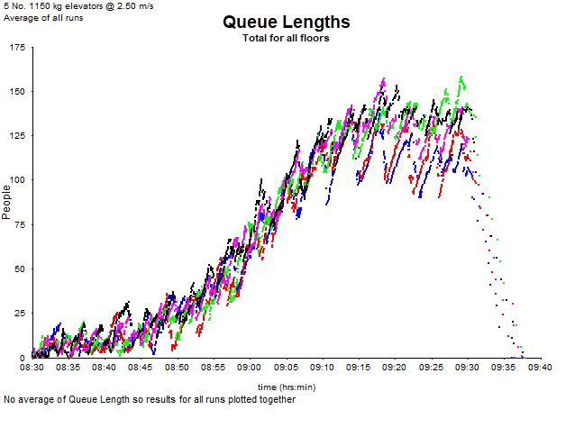 A traffic analysis using Up Peak and Lunch templates from Peters Research was conducted. Figure 1 is a plot of the queue lengths during Up Peak.