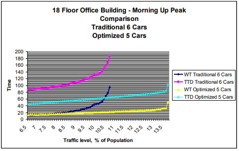 The traditional system used a generic group control system and had the performance criteria used in the UPRTT method. The Optimized system used a proprietary destination based system and high performance door and drive systems