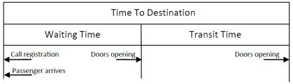 The time to destination is defined in CIBSE Guide D 2010 as the time from when a passenger either registers a landing call or joins a queue, until the responding lift begins to open its doors at the destination floor and is divided into waiting time and transit time (CIBSE,2010) [3]. See Figure 1.