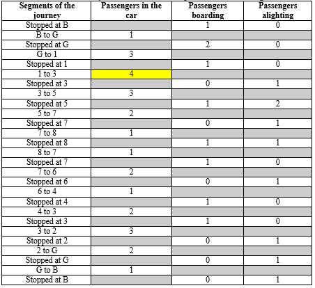 As can be seen in the table, there are 4 inter-floor passengers, 2 outgoing passengers and 3 incoming passengers. The full journey is now analysed in terms of stops and passengers in the car throughout the round-trip as shown in Table 2.