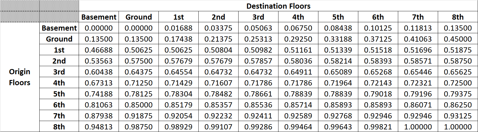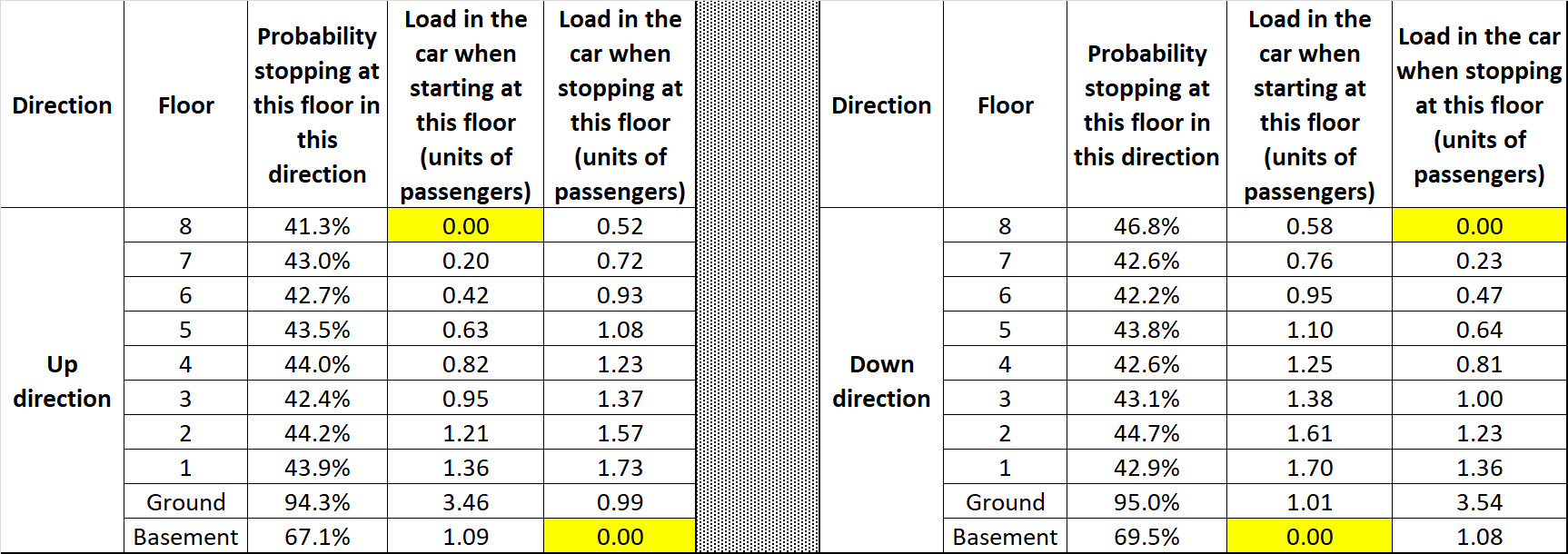 - The number of passengers inside the car when it starts at each floor. A distinction is made between the start at a floor in the up direction and the down direction. This is compiled into an average load inside the car when it starts in a certain direction. This is shown in a tabular format in Figure 5. It is worth noting that the four cells highlighted in yellow have zero values in them. As expected, the car cannot start at the topmost floor when travelling in the up direction, and it cannot stop at the lowest-most floor when travelling in the up direction. A similar argument applies when travelling in the down direction.