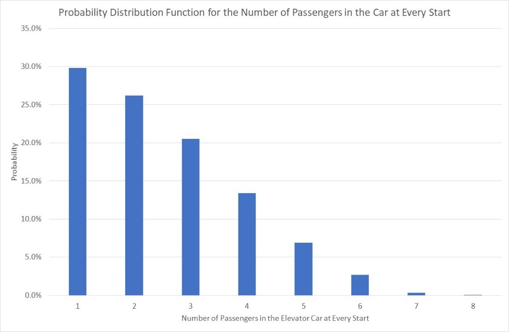 Figure 3: The PDF results for the number of passengers inside the car at every start, in units of passengers and at a lunchtime traffic (45% incoming: 45% outgoing: 10% inter-floor).