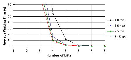 With a design interval of 30 seconds, four lifts at 1.6 m/s is the minimum specification choice based on these analyses.