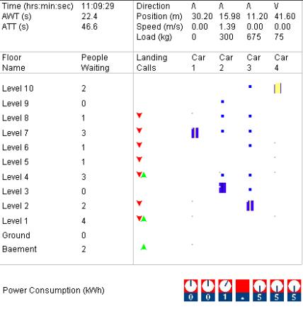 The traffic simulation program uses the information about the elevator installation and passenger traffic to give the energy model details of every trip that is made. The energy model calculates the power consumed, displaying a Watt-hour meter during simulations, and the total power consumed at the end of the simulation (see Figure 5). Power factor measurements will be added to a future version of the model.