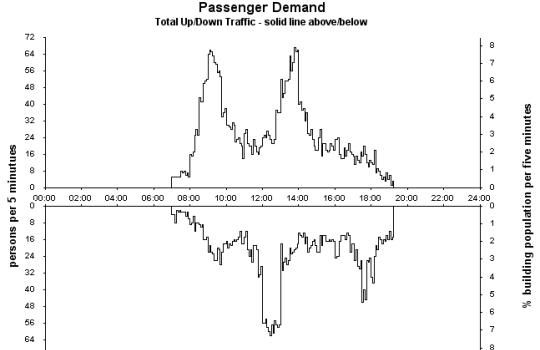 By generating a passenger traffic profile for a whole day, the daily energy consumption can be measured. Figure 6 is a representation of traffic for the whole day in an office building, based on measurements made in a multi-tenant office building [4].