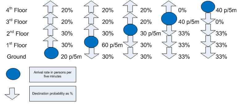 There are other sources of information, including manufacturers’ planning guides, but these tend to re-iterate the recommendations of above. Barney, dos Santos[1] and Strakosch[2] present example diagrams of passenger traffic in a commercial, office building. These diagrams have been re-drawn in Figures 1 and 2.