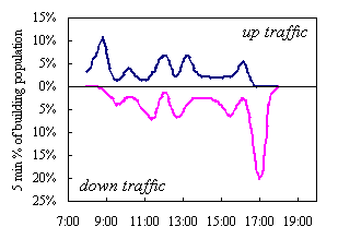 | Building | Traffic period | Peak 5 min % building population using lifts |