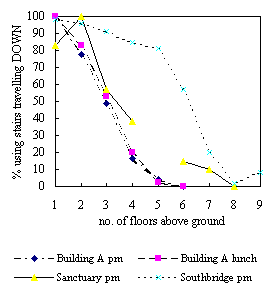 In the Building C (Figure 5) survey, use of the staircase was virtually nil in spite of the lifts being heavily loaded and long passenger waiting times; the main staircase was an unattractive fire escape sited well away from the lift lobby. Figure 11 shows the associated stair usage for the BRE[7] and Building A (Figure 3) surveys
