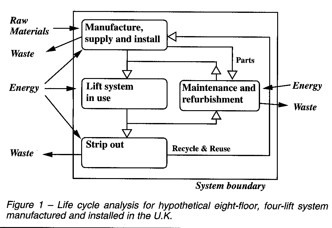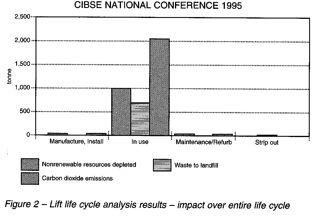 The lift cycle analysis of a typical lift system was considered in ‘Green Lifts?’(1). The hypothetical lift system presented in Figure 1 was analysed, giving the results summarised in Figure 2. The dominant environmental burdens of this lift system are the depleted non-renewable resources, the created waste and the emissions generated through the production of electricity or lift operation. This will be typical for the vast majority of lift systems.